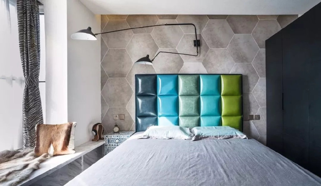 主卧,主卧里床头背景墙上贴的灰色的六边形砖,搭配一个渐变色的靠背,充满了趣味性。床头一侧还做了黑色的大衣柜,看起来很有个性。而且卧室里还有一个小飘窗,飘窗下面还带有收纳,很有创意。