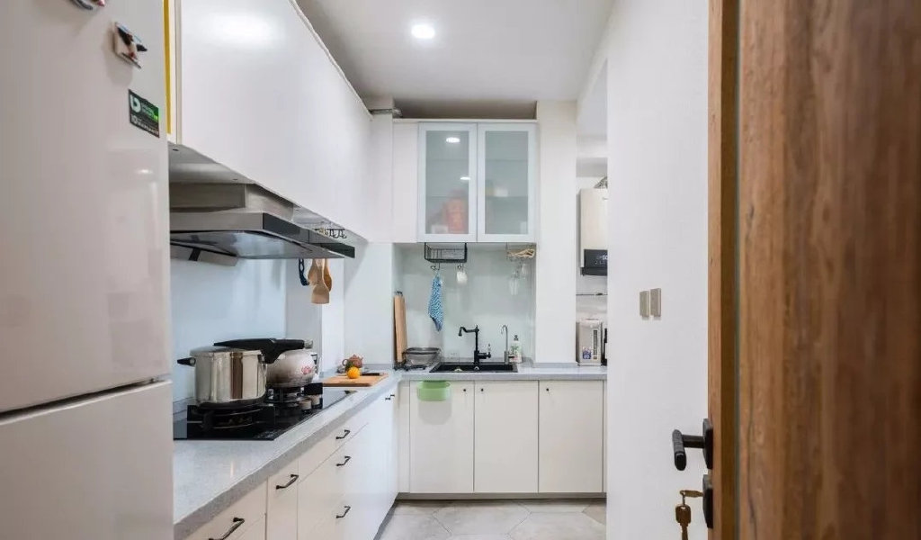 厨房,厨房里是L型的布局,而且厨房里的空间有点不规则,白色的橱柜沿着墙面摆放,还做了白色的吊柜,把冰箱等厨电也嵌入橱柜里,整个厨房看起来干净又整洁,一点也不显杂乱。