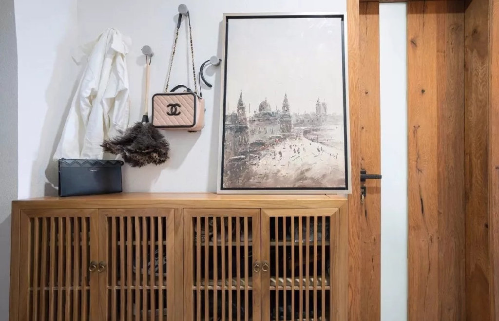 玄关,进门摆放了木质的鞋柜,格栅门的鞋柜空气流通不会有异味,鞋柜的上面还可以摆放一些挂画装饰,墙面上也做了挂钩,使用起来很方便。