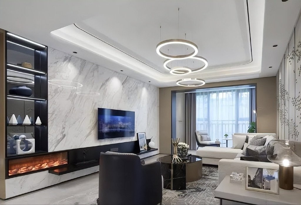 客厅的电视背景墙做了整墙大理石的设计,在大理市中间留出一部分做了嵌入式的展示柜和隔板电视柜,加上藏光看起来更加大气。