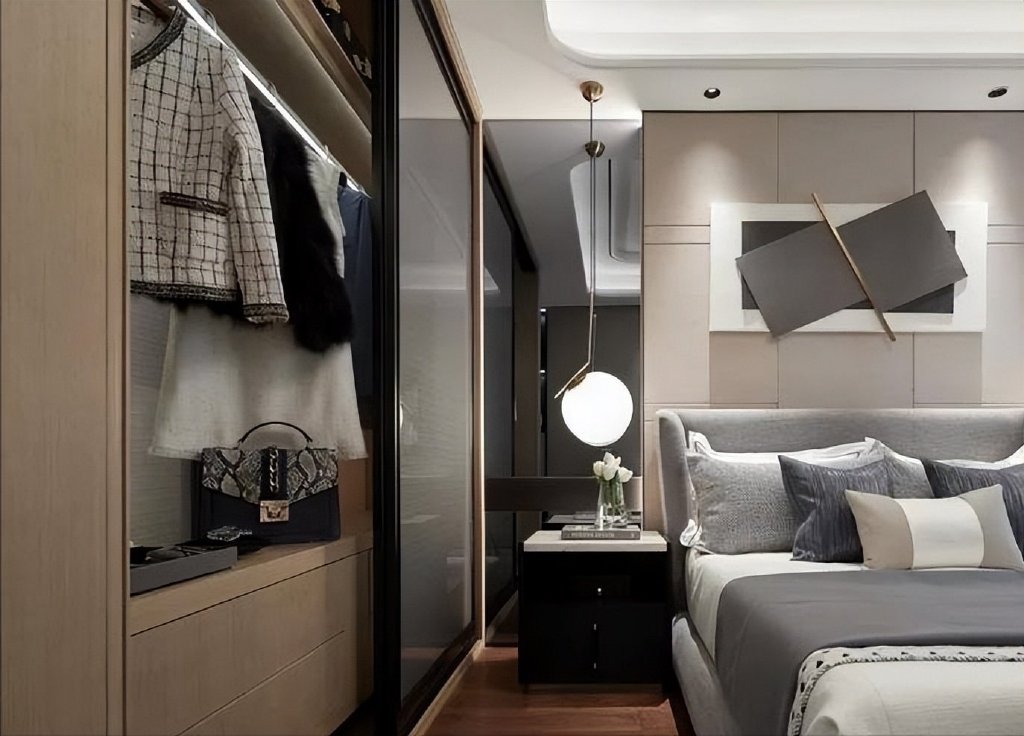主卧的床头背景墙做了两侧对称的茶镜设计,中间区域选择了硬包的造型,再加上床头灯和藏光的衬托,让人感觉非常帅气。