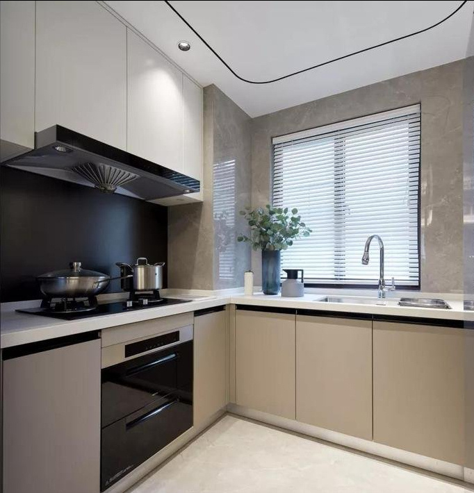 厨房的橱柜做了U字形的布局,动线设计合理也增强了储物能力。香槟色的柜门搭配浅灰色的墙地砖,整个厨房看起来温馨又舒适。
