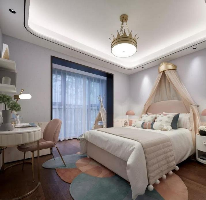 儿童房的床选择了更为可爱的公主房,整体的配色和款式都让人感觉非常优雅。顶部的吊顶四角做了弧形的设计,看起来更加柔和、舒服。