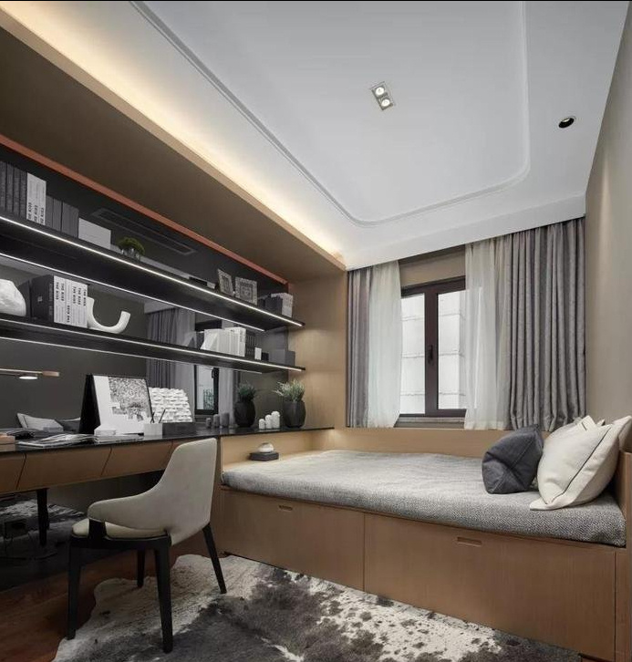 书房是被设计成了榻榻米床组合书桌的款式,在墙面用隔板来收纳,整面墙都做成黑色的茶镜,让人感觉非常的独特和有格调。