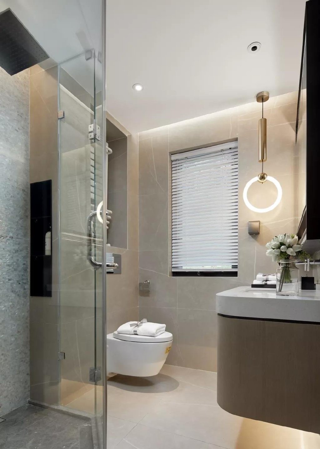 卫生间内部做了干湿分离的设计,整体暖色调的墙地面。在角落里装上一个钻石型的玻璃淋浴房,洗手盆台面做了圆滑的转角,整体设计更加安全舒适。