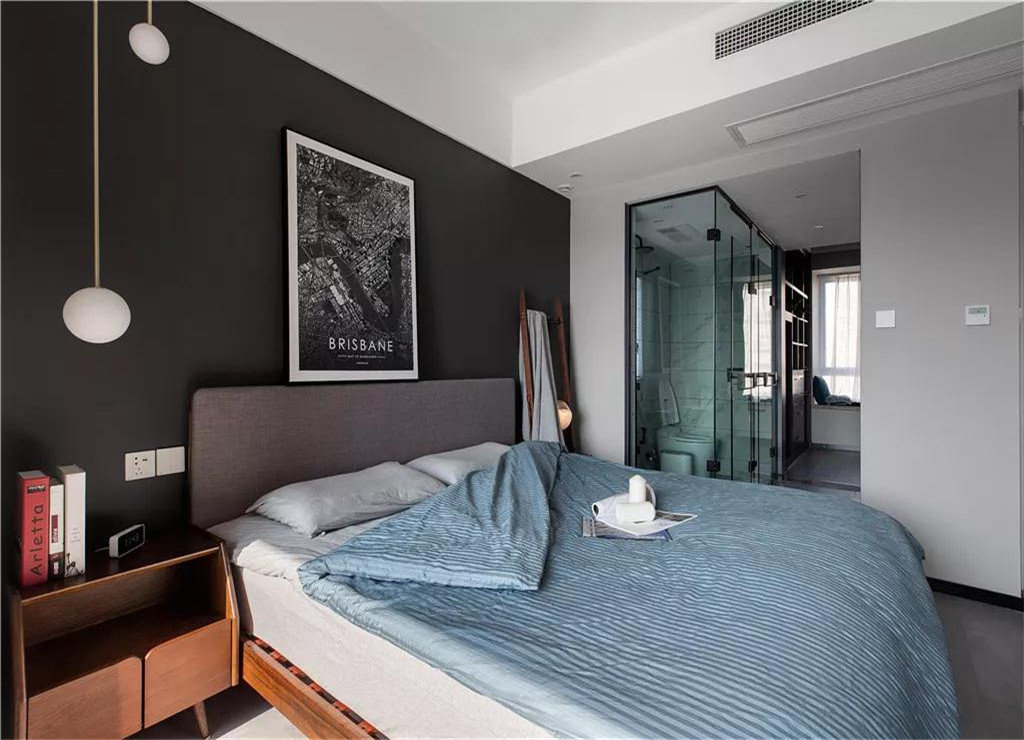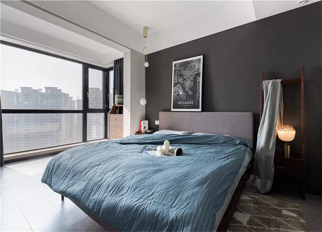 主卧室的配色方案是黑白灰为主,搭配孔雀蓝的床品,卧室外的阳台被包了进来,让卧室看起来更加宽敞。床头一侧的床头柜还兼具了衣架的作用。