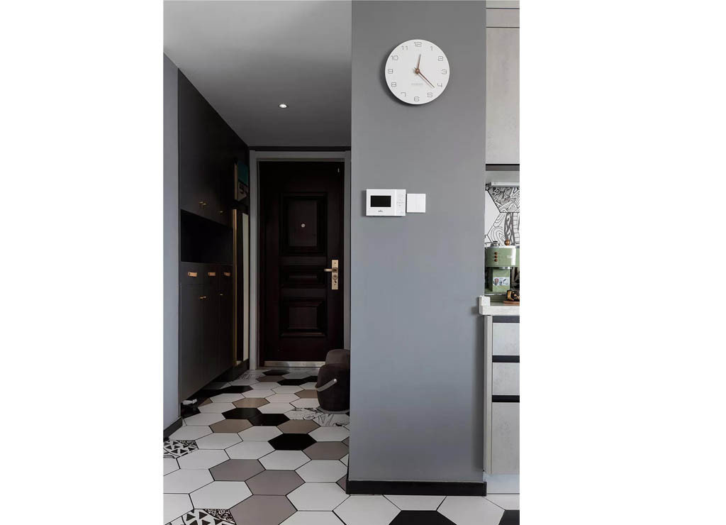 入户玄关处做了嵌入式的鞋柜,鞋柜的底部和中间都选择了留空一部分,还把穿衣镜也整合到了柜子上。地面创意的六边砖让玄关看起来更有格调。