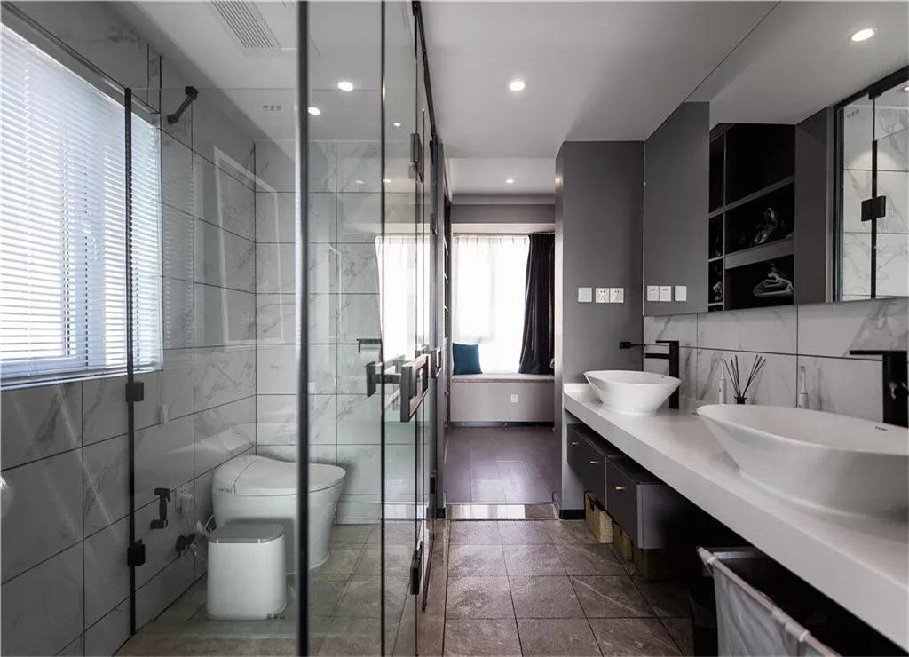 但觉得也会有一些尴尬,把马桶处的玻璃改成磨砂款的会好一些,双台盆和大面积浴室镜的设计让卫生间看起来更大气一些。