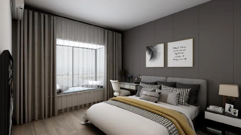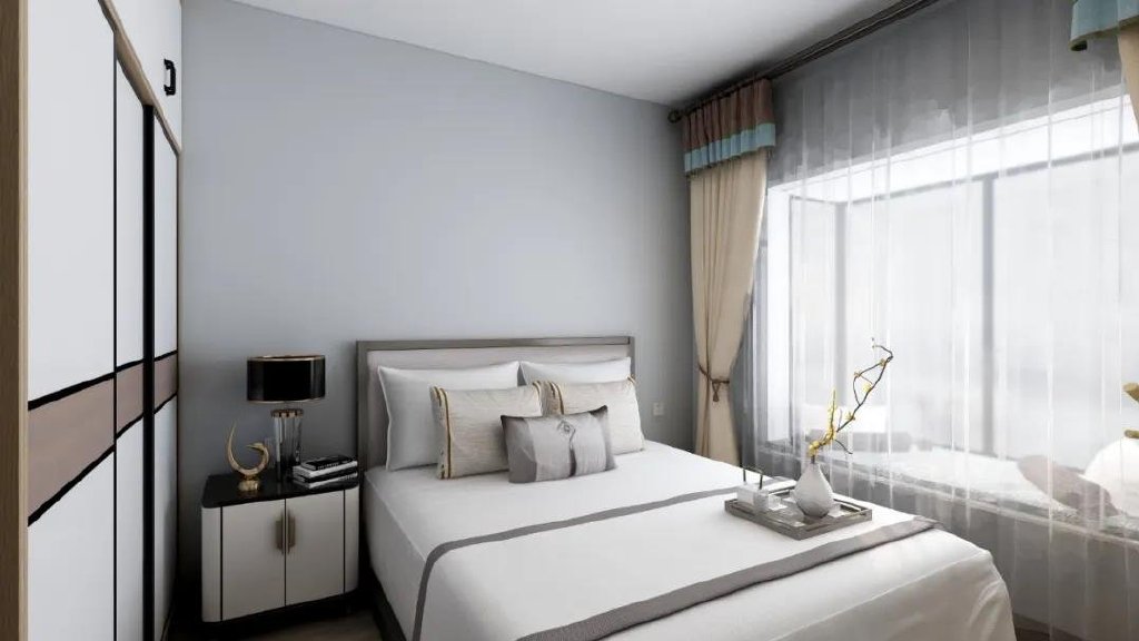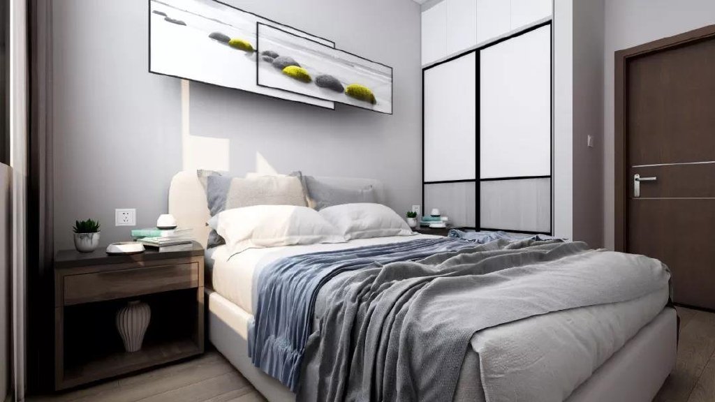 主卧因为面积问题不适合做过多的装饰,所以设计就选取了床头背景作为表达情感设计的切入口,灰白的背景,方形框景,床头柜的小盆栽枝繁叶茂,寓意吉祥。