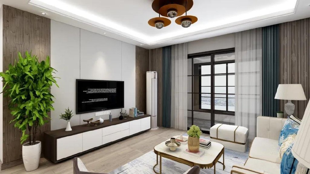 客厅电视墙是简约的装饰,灰白电视柜上边摆着禅意的中式小物件,整体氛围显得轻松又闲适;金属框架的大理石茶几,结合中式风格的沙发,充满了实用闲适的氛围感。
