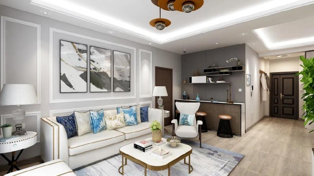 客厅的设计非常简洁,所谓的背景墙也不过是一副“山河”,再将中国园林传统的借景方式运用到此处,让整个空间流动起来,生生不息。也借以表达对自然的敬畏之心。客厅旁的入户转角,靠墙位置装了个小吧台,筒灯下方还布置上了隔层置物架,可以放置书籍等物品,整体充满了精致舒适的氛围感