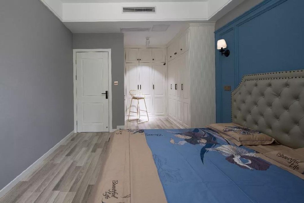 主卧室的床头背景墙被刷成了蓝色,而主卫被设计师改成了开放式的衣帽间,白色的柜子搭配深蓝色的背景墙,看起来别有一番风味。