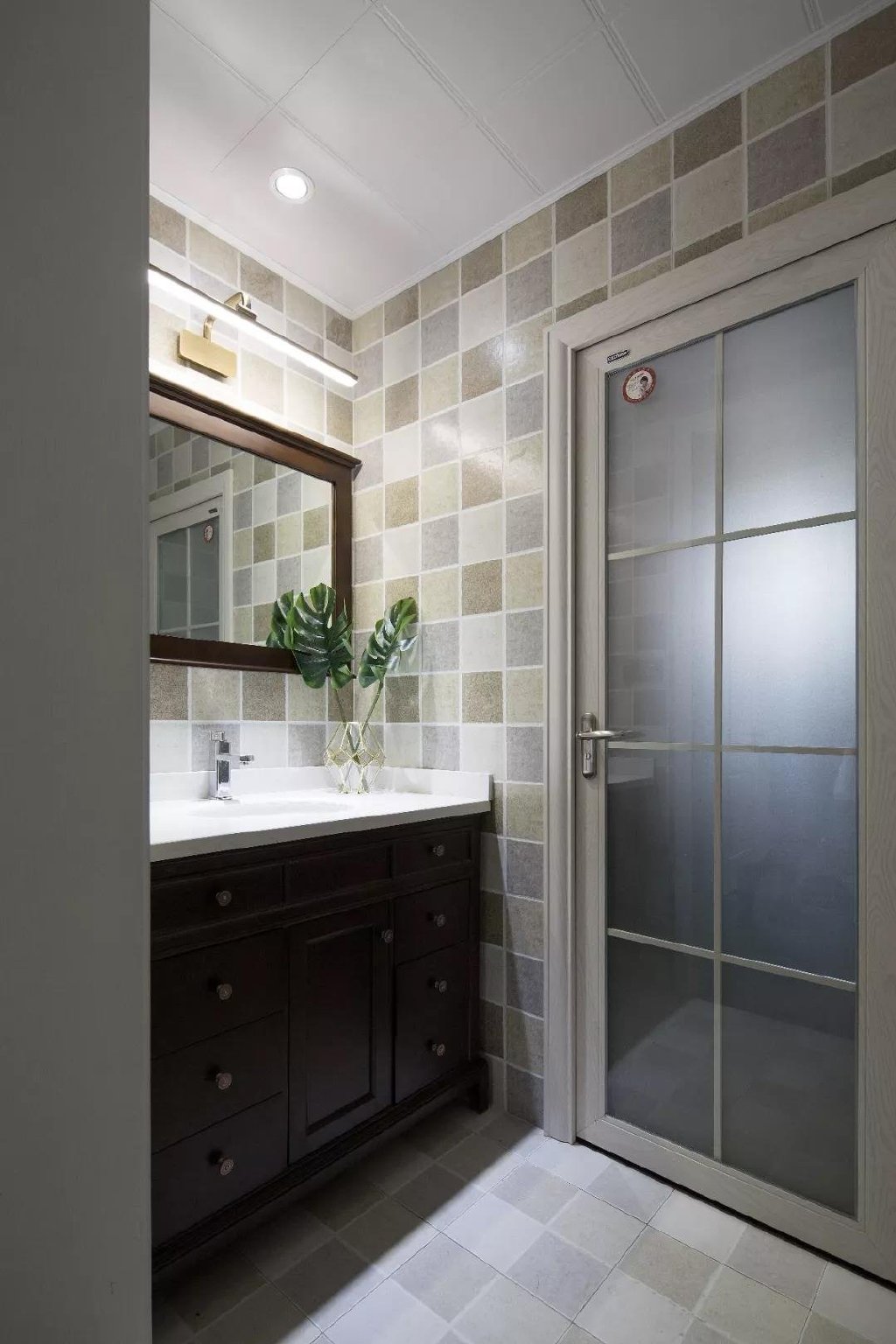 卫生间的洗手台被放在了门外,多彩的仿古小砖铺满了这个空间的墙地面,深木色的浴室柜和浴室镜带来更传统的美式风感觉。