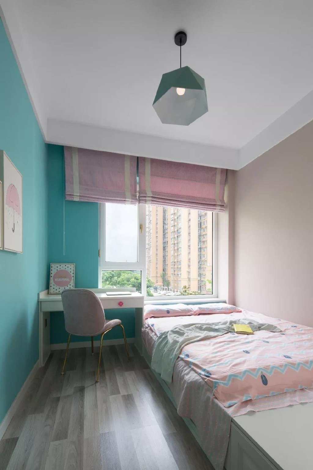 儿童房的配色会更为清新一些,绿色搭配藕粉色,床品和窗帘的颜色和款式都比较可爱,整体给人一种浪漫、优雅的感觉。