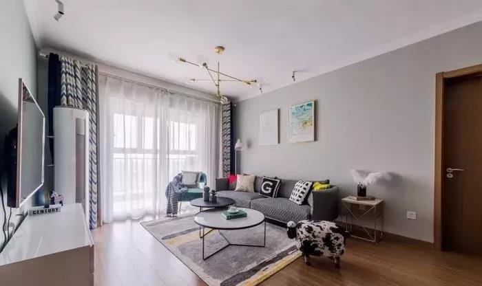 客厅处的软装以黑白灰为主,黑白色的条纹窗帘和灰色的沙发、地毯构成一个层次明显的空间