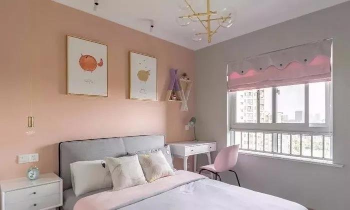 主卧室同样是简洁当中透露出浪漫感,蜜桃粉色的窗帘和深蓝色的床头靠背给这个简洁的空间带来了更多的优雅感。
