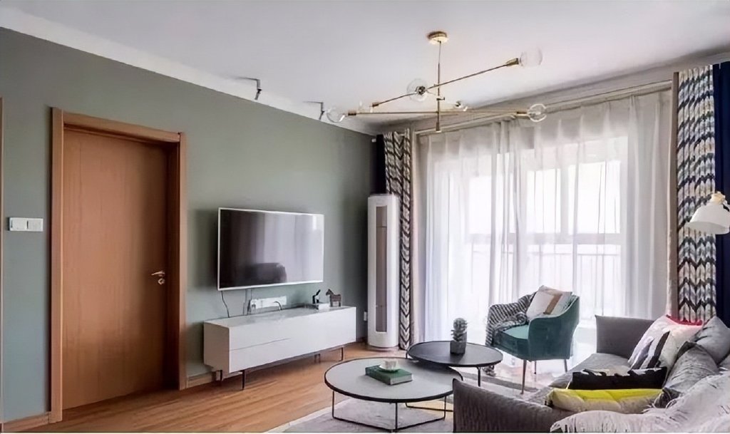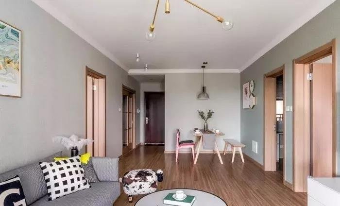 电视背景墙上同样没有做什么装饰,木门和门套、踢脚线用了相同的颜色,和木地板结合起来,更有整体感,不会显得太过突兀。
