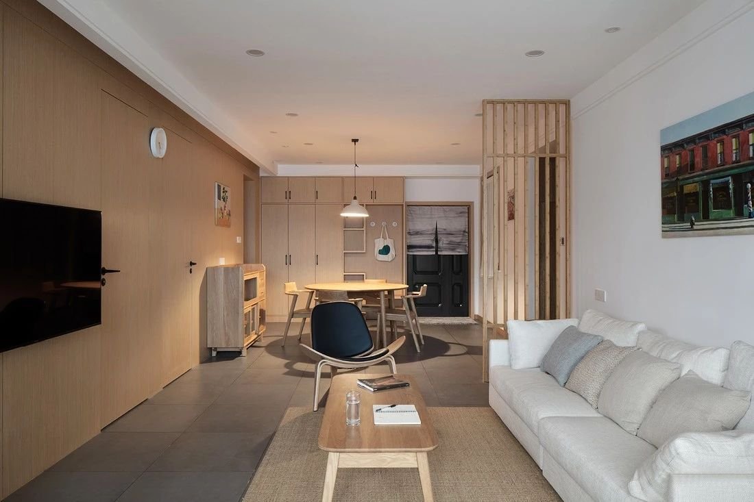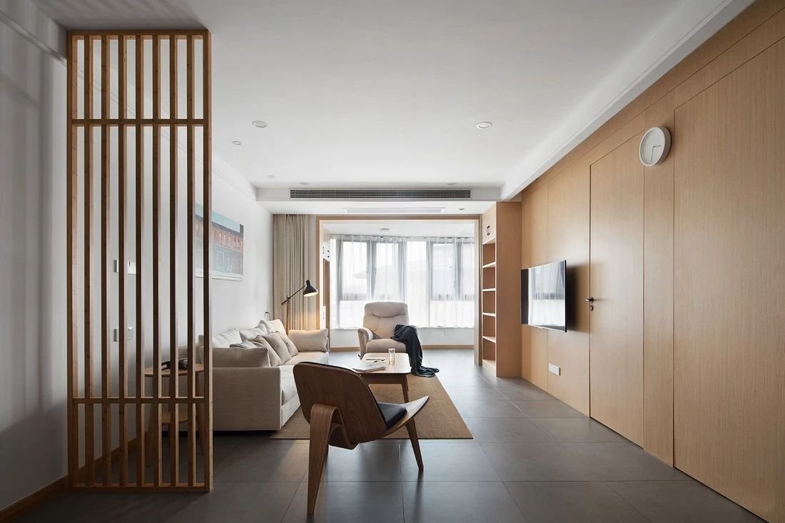 客厅空间整体简约大方,以灰色地面砖搭配木质电视墙与屏风,呈现出一个自然舒适的空间感。