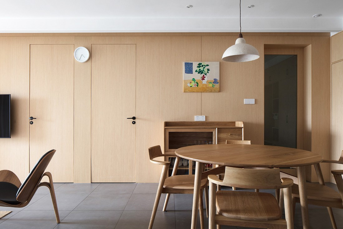 餐厅的背景墙连着客厅电视墙,木质的墙面与定制柜让空间显得自然大方。空间的照明为无主灯设计,在光线的层次上做了很细腻的处理。
