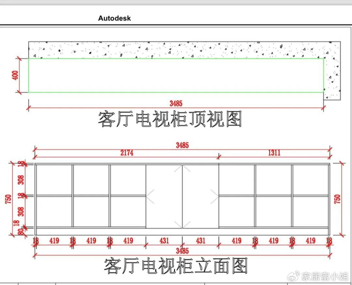 半高柜两边做开放格,搭配上底部的收纳筐,可以用来收纳书籍、玩具和零食;中间做对开门柜,则隐藏了电视机线路和路由器设备。附上我家的图纸供参考。